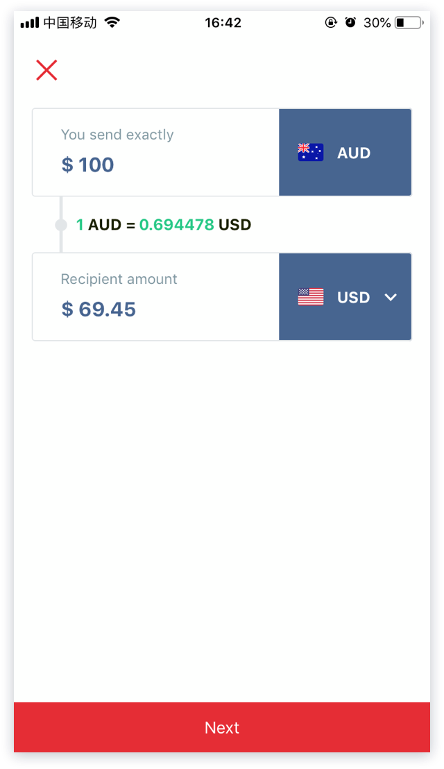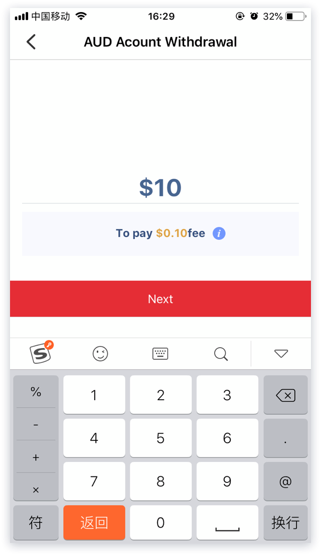 ————输入转出金额、选择币种,确认汇率与转入金额后,点击下一步; 注:汇款操作不支持同币种汇款业务,若需要同币种汇款,请选择提现操作,详见章节4