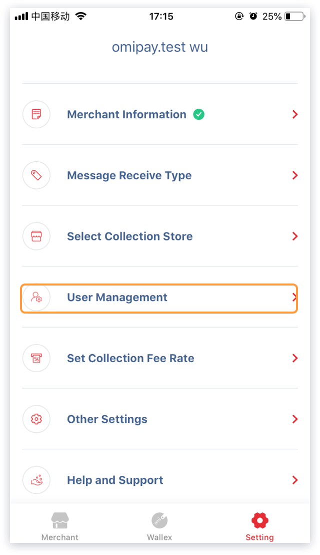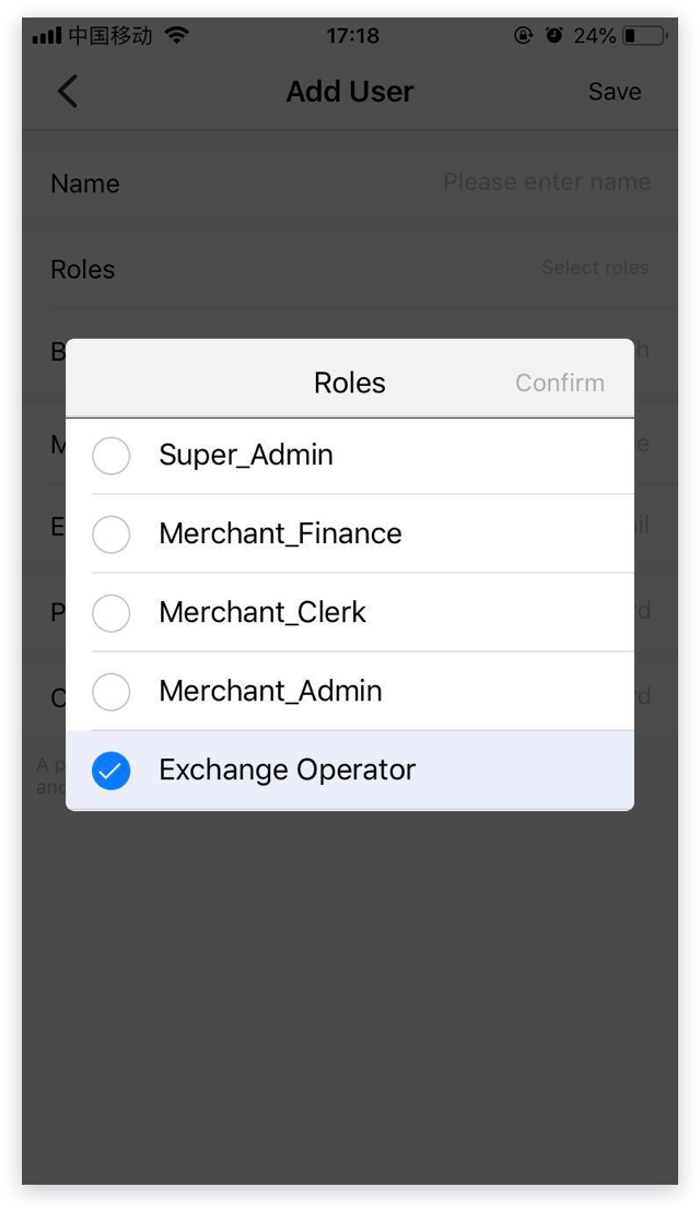 仅具备超级管理员或汇兑操作员权限的账号可以进入Wallex页面;若需要添加用户进行汇兑业务操作,则需要在新增用户时选择对应权限;点击底部菜单-设置,在设置页面点击用户管理