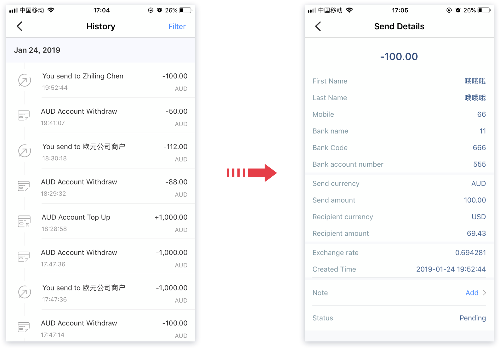 ——在历史记录中可查看充值、提现、兑换以及汇款操作记录,点击记录可查看详情;点击右上角【筛选】可对历史记录进行筛选。
