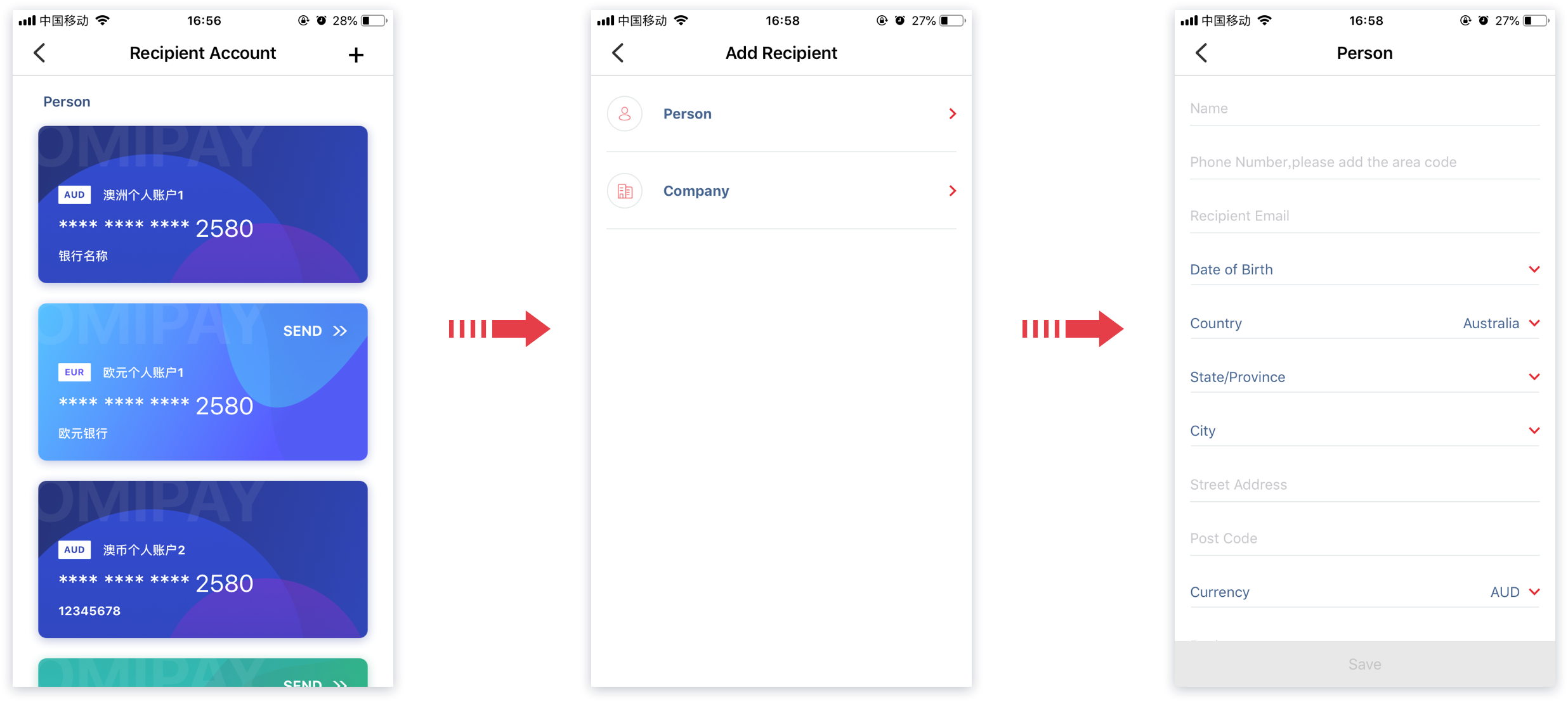 ——点击页面右上角的【+】图标,可新增收款人选择收款人类型后,填写收款人信息完成创建;