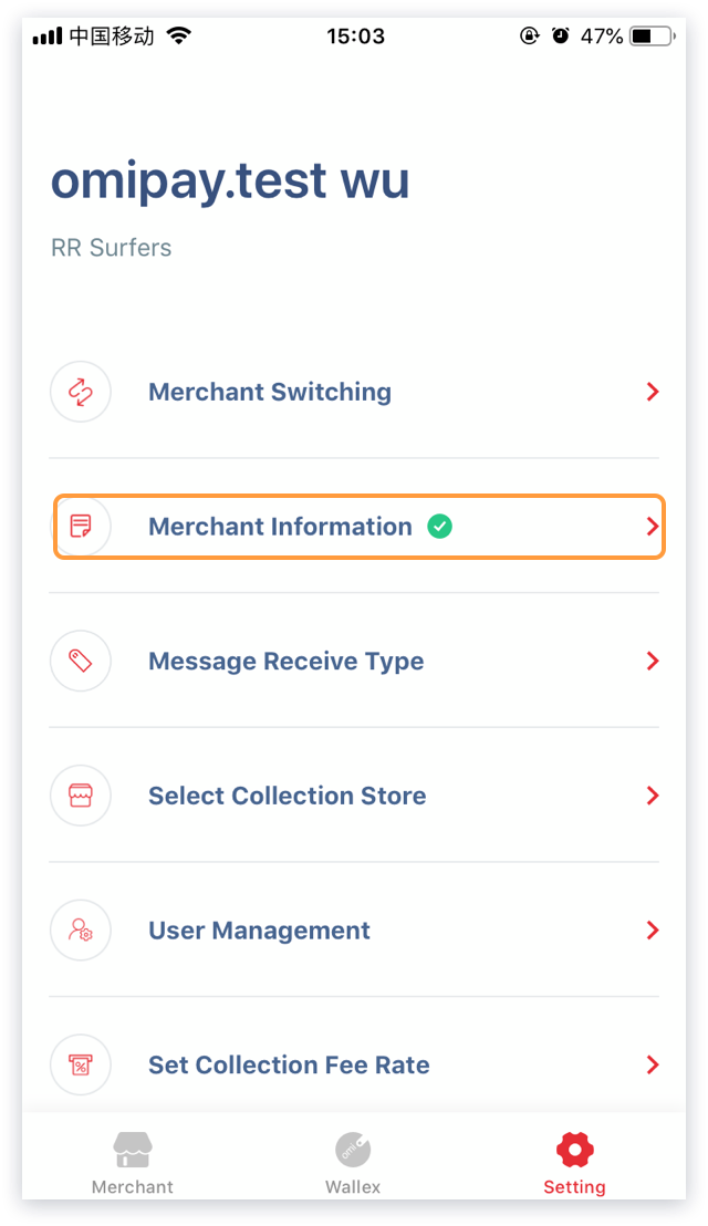 ——1.1在底部菜单中点击设置,并选择商户信息;若展示图标为“√”,则表示已通过验证,可直接使用汇兑功能;若展示图标为“!”, 则表示未通过验证;在商户信息底部点击按钮【去验证】