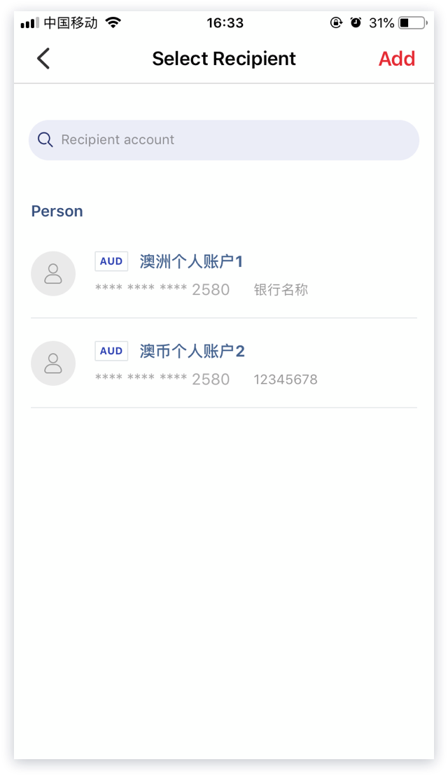 ————确认提现金额后,需选择收款人;若未创建收款人,可通过点击右上角-添加进行新增收款人;注:提现操作仅支持选择同提现币种的收款人,若需要跨币种提现,请选择汇款操作,详见章节5