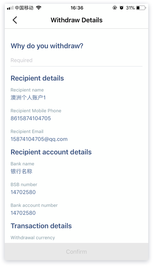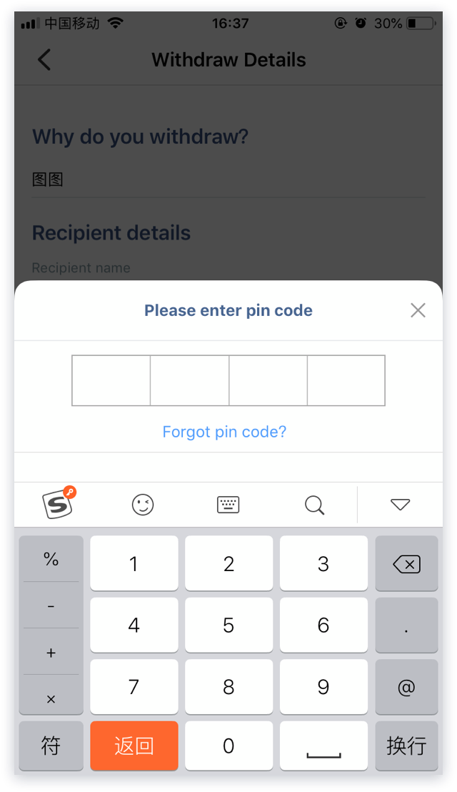 ——确认提现信息无误后,需通过PIN码进行安全验证(IOS系统支持Touch ID/Face ID进行验证)