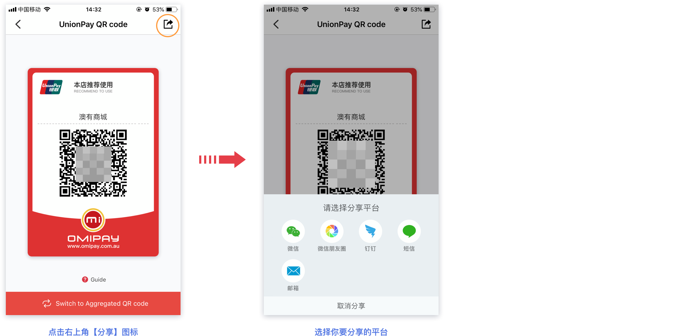 收款店员通过OmiPay APP/POS【收款功能】,切换至银联收款码,输入订单金额后,生成订单收款码;