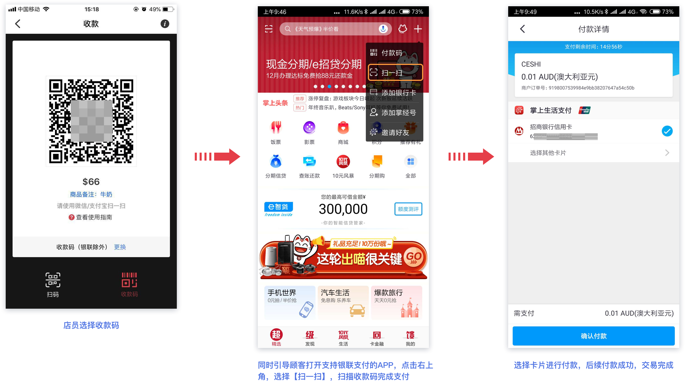顾客打开支持银联支付的APP(图中以掌上生活为例),点击右上角,选择付款码,并出示给收款店员
